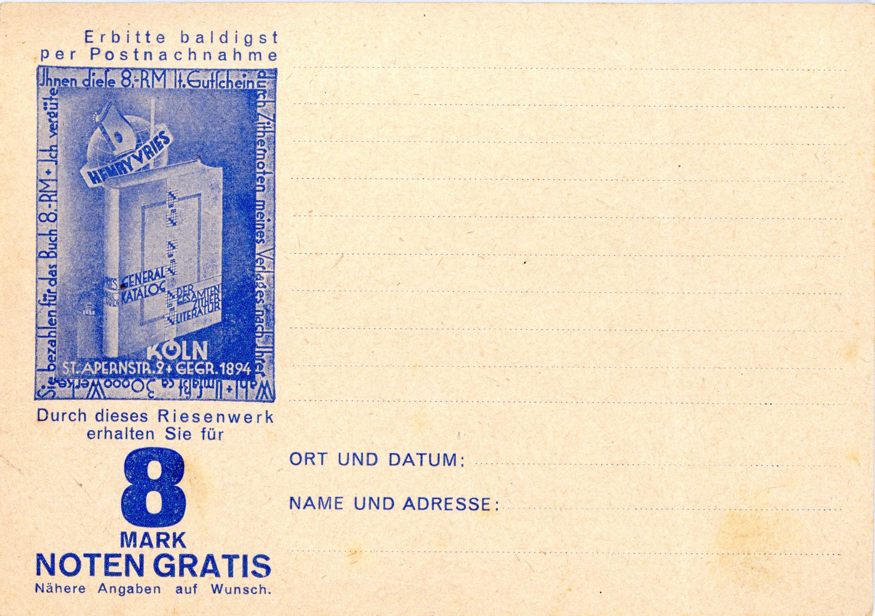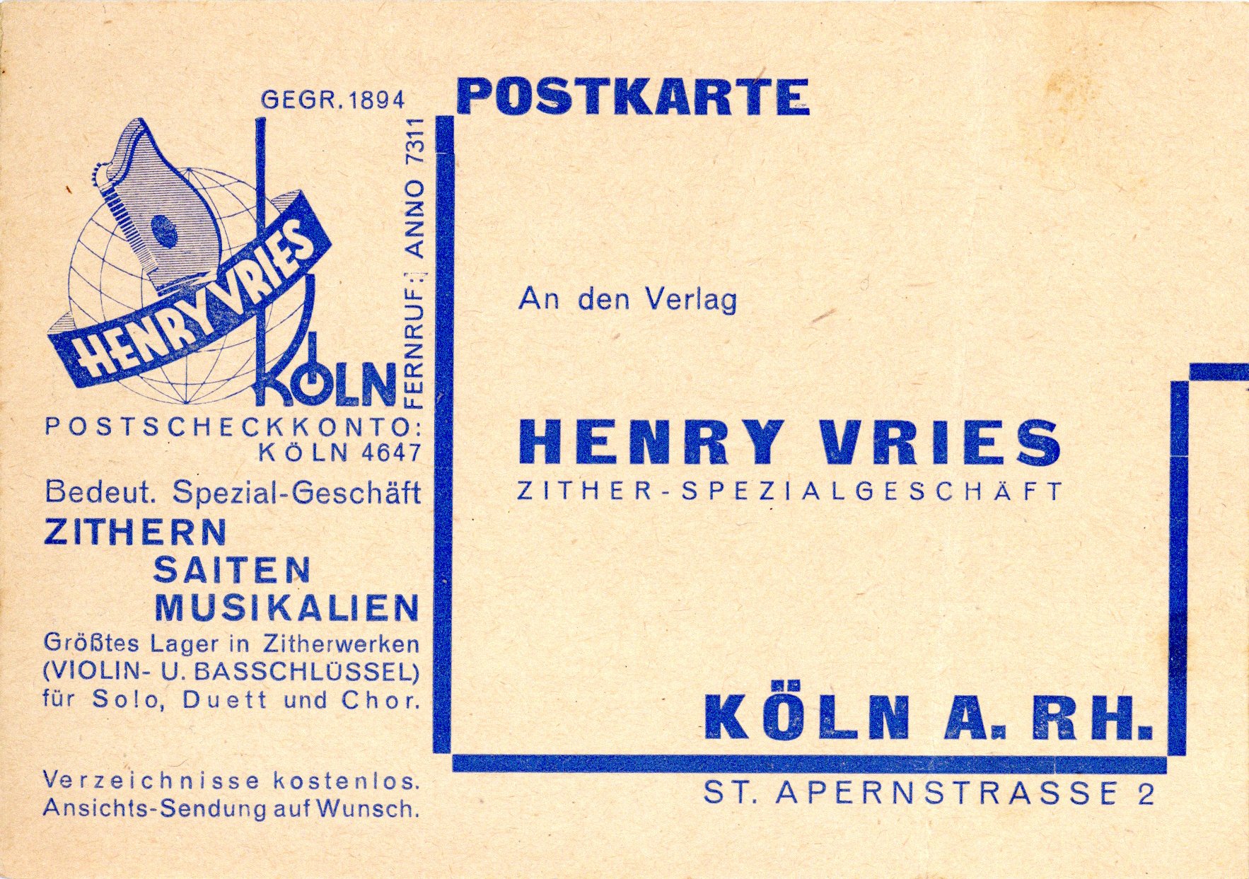 Bestellkarte an Henry Vries Zither-Spezialgeschäft, Köln a. Rh.