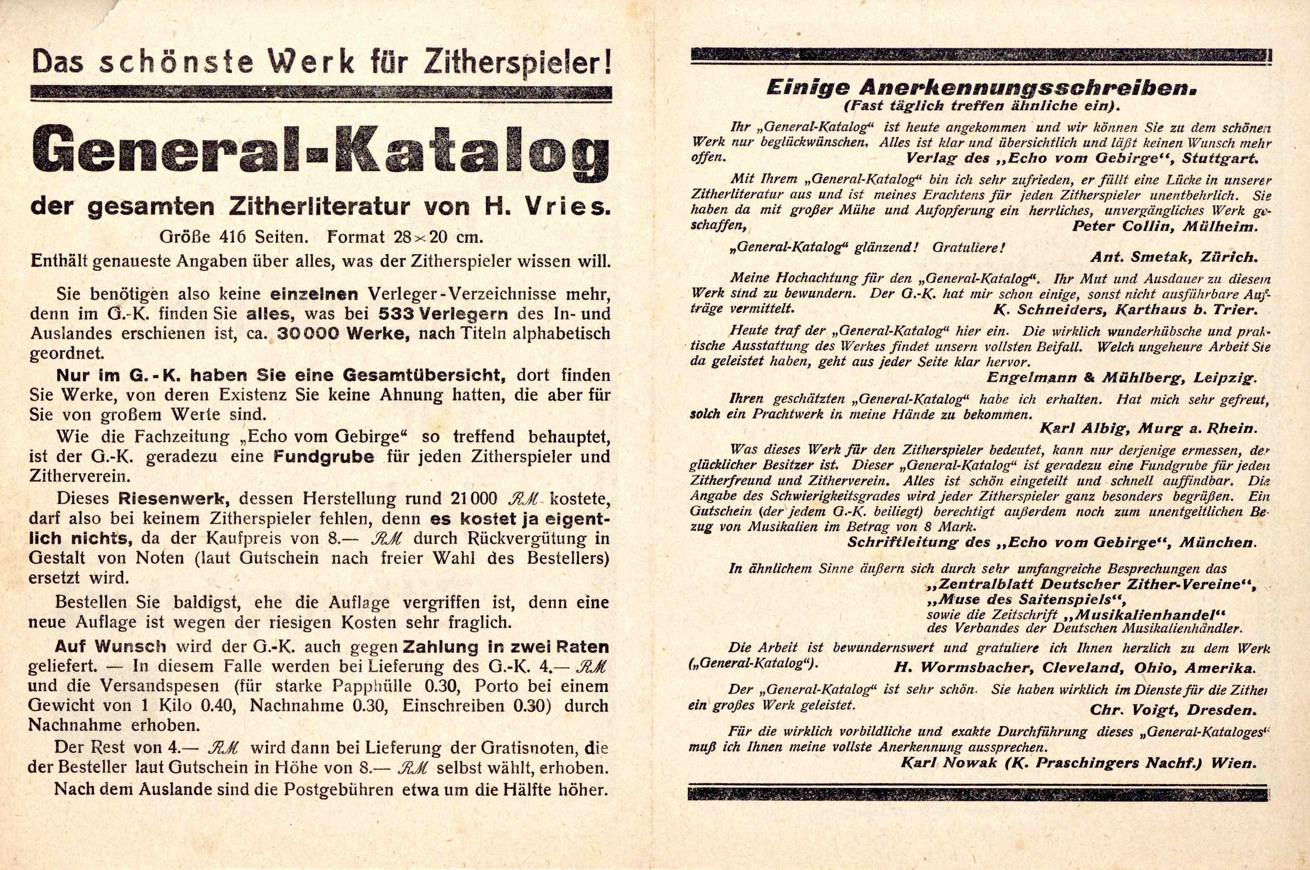Da er selbst Musikalienhändler war, kam ihm die Idee, einen Katalog zu erstellen, anhand dessen die verfügbaren Werke leicht nachzuschlagen sein sollten. Zu diesem Zweck unternahm er die Mammutaufgabe, alle in seiner Zeit verfügbaren Werke zusammenzutragen und die entsprechenden Informationen systematisch darzustellen. Ohne Computer, wohlgemerkt. So entstand der Generalkataloge der Zitherliteratur.