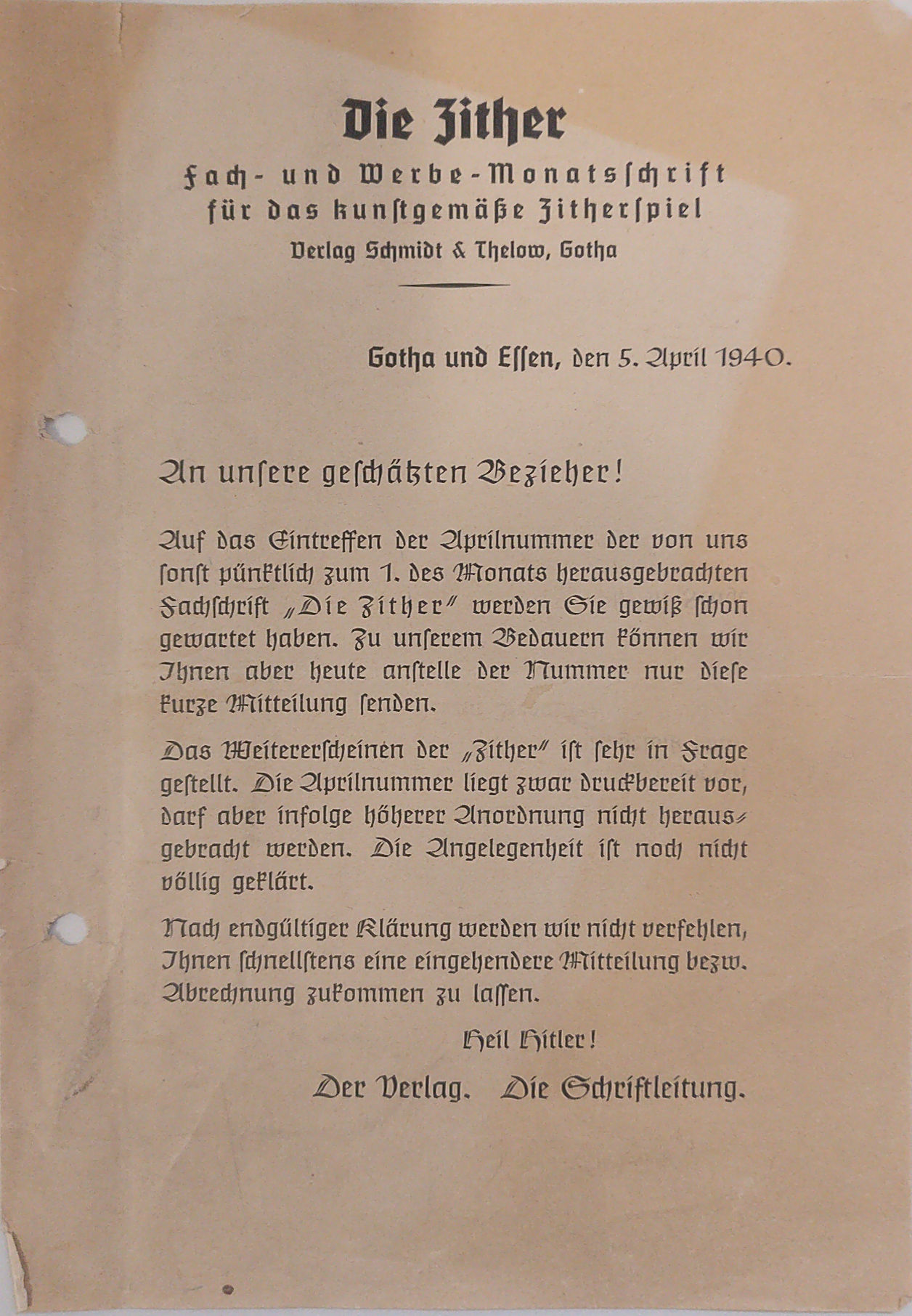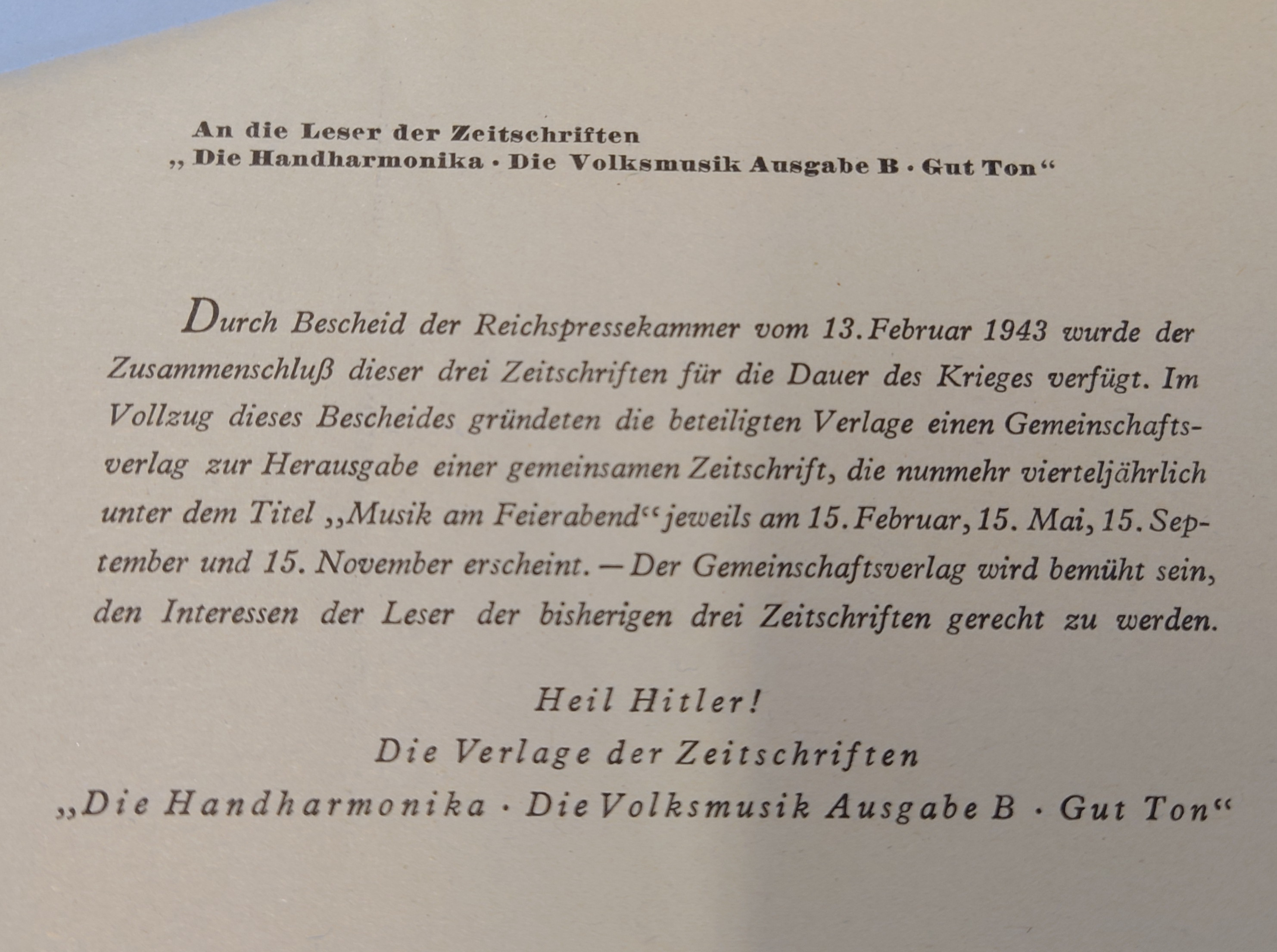 Hervorgegangen aus dem Echo vom Gebirge und dem Zentralblatt im Zuge der Gleichschaltung im 3. Reich. Mit dieser Mitteilung aus April 1940 endet das Erscheinen dieser Zeitschrift abrupt. Es kursiert die Erzählung, dass die Ausgabe 1940/April bereits gedruckt, aber nie ausgeliefert wurde. - [1936] Die Volksmusik - Zeitschrift zur Pflege und Förderung der deutschen Volksmusik (Mantzke, Berlin)